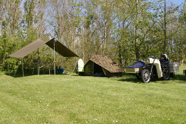 Zwei NVA- Ponchos bilden das Dach.