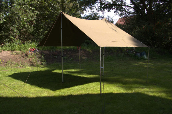 Das Tarp kann in mehreren Varianten aufgestellt werden. Meist allerdings als gleichseitiges Dach. Gegen Wind ist es recht widerstandsfähig.
